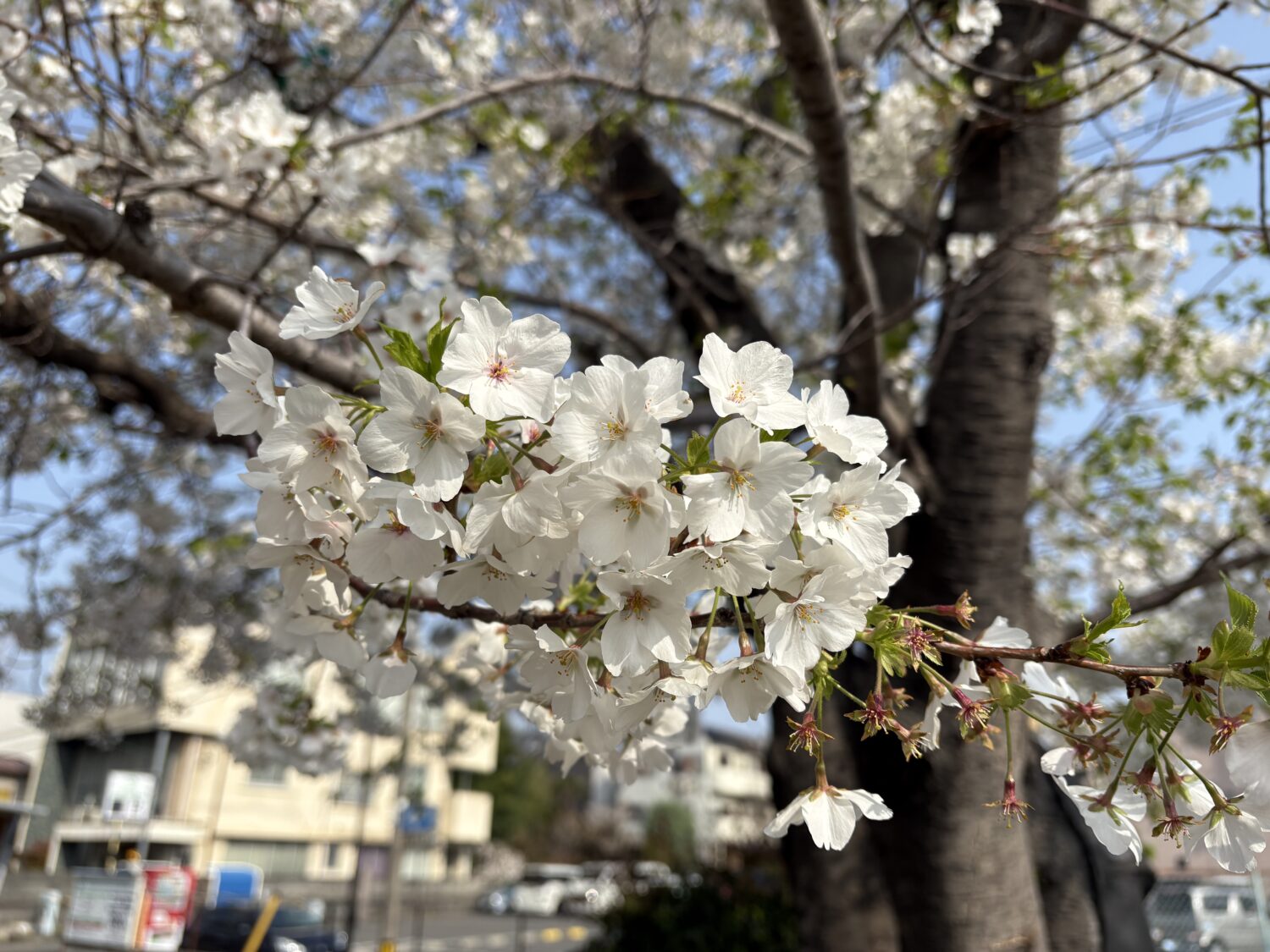 以前はもっと枝ぶりが良かったそうです。今は枝に添え木や補修の跡がありますが、朝の青空に桃色の花びらが美しい光景でした。