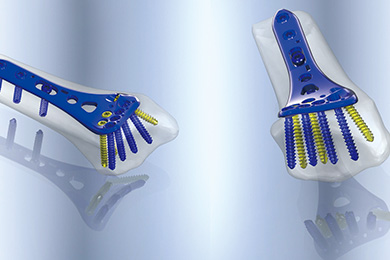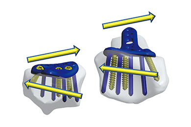 まさに一長一短ですね。しかもこれまでのプレートは、「全部固定」「全部自由」のどちらかしかありませんでしたので、この両方の機能を1枚のプレートに持たせた「ハイブリッド方式のロッキングプレート」を考案しました。1列目が固定で2列目は接触しない範囲で角度を変えられる、まさに両方の機能の“良いとこどり"なのです。これによって手術はスムーズになり、また固定力も強固になりました。