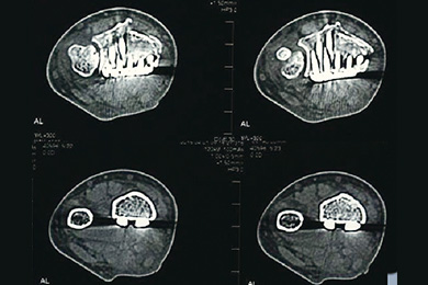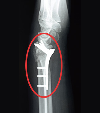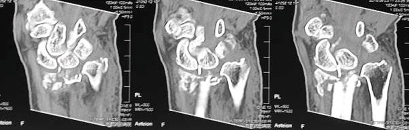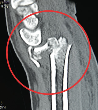 このCT画像のような粉砕骨折のケースでも、ハイブリッドロッキングプレートを用いた固定支持が可能です。