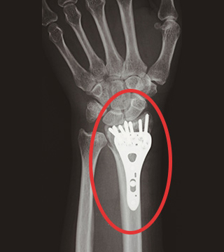 プレートを見ていただけば分かるように、これまでの平面なプレートと異なり橈骨に合わせた捻れた形状になっているので、骨との適合が非常に良いのです。骨にフィットすることはもちろん、骨の表面を通っている親指を動かす腱に干渉しないため、従来のプレートと比較すると腱断裂などの合併症予防にもつながります。