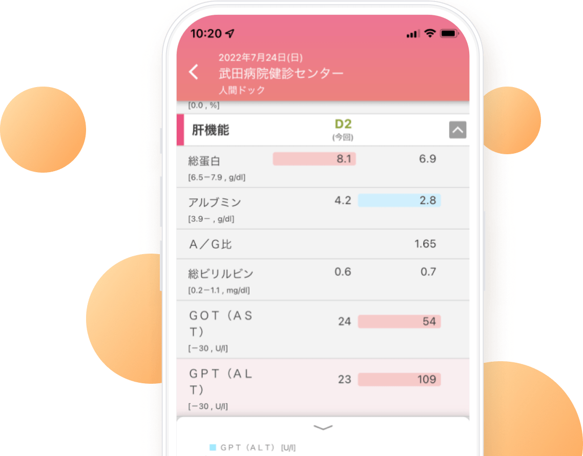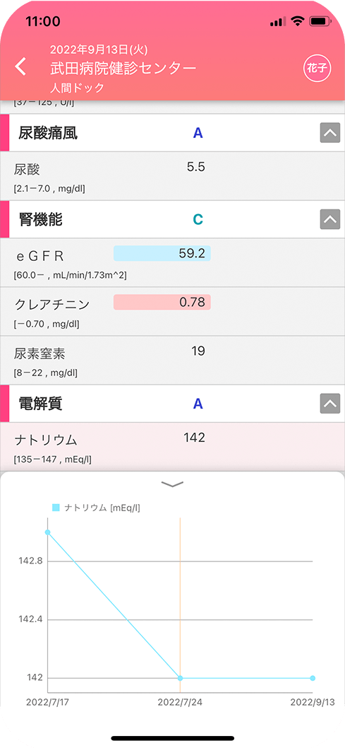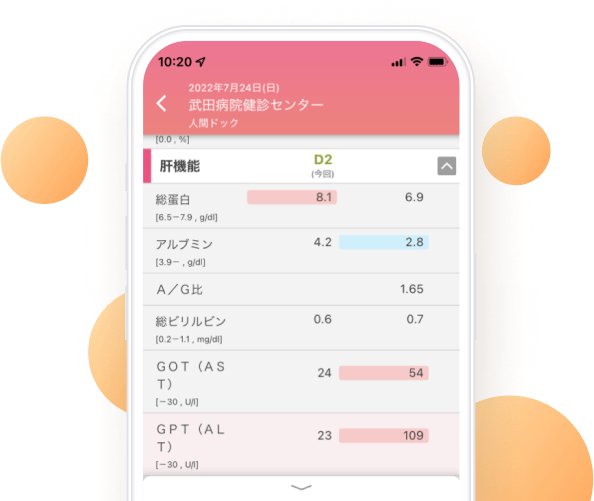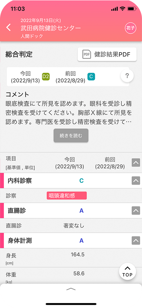アプリは基本無料(※)でご利用いただけます。通常の無料プランでは健診結果は過去一年分しか参照できませんが、武田病院健診センターで健診を受けていただくと過去5年分の健診結果を見ることができるようになります。(結果表PDFはダウンロード可能です。)ご希望の方はご予約時または受診時にお申し出ください。