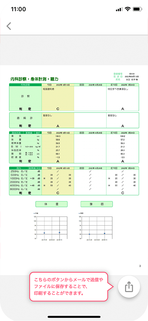 従来の紙の結果と同内容のPDFデータをダウンロードしていただいたり印刷していただけます。また、診療先の医療機関のPCがインターネットに接続されている場合は、アプリ内の健康診断結果を一時的に共有することができます。