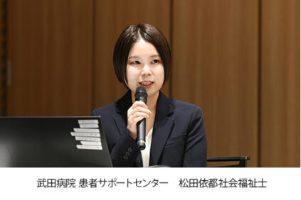 松田社会福祉士は冒頭、「『医療ソーシャルワーカー(MSW)って?』とMSWの役割について取り上げ、医療機関の中にいる福祉の専門職であることを強調。退院支援や社会復帰援助など様々な役割について紹介しました。また、急性期病院への入院時や退院時、回復期リハビリテーション病院への面談・相談が実際にどのようなものかを動画を使って分かりやすく紹介しました。また松田社会福祉士は、「制度の説明や情報提供だけではなく、『生き辛さを少しでも無くす方法を一緒に考えていくこと』が私たち退院支援職員の相談支援です。当院は各病棟にMSWと退院支援看護師、外来にもMSWを配置しています。入院時に限らず、外来でも病後の生活やお仕事のことなど何でもお気軽にお声がけいただければ幸いです」と会場に呼びかけました。