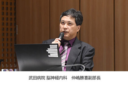 講演2は、引き続き山名院長が座長を務め、康生会武田病院脳神経内科の仲嶋勝喜副部長が「脳血管障害と認知症」と題し講演しました。