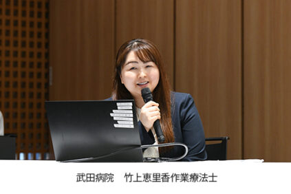 講演4は、十条武田リハビリテーション病院の久保洋昭副院長が座長を務め、康生会武田病院の竹上恵里香作業療法士が「脳卒中になったその日から始まるリハビリ」と題し講演しました。