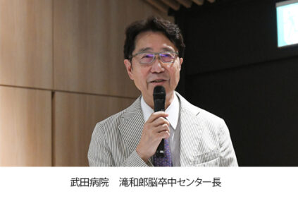 開会挨拶で康生会武田病院の滝和郎脳卒中センター長は、「脳卒中は急性期での治療が非常に重要です。当院は24時間体制でtPA治療・血栓回収治療が可能なPSC(一次脳卒中センター)コア施設に認定されており、万が一発症された場合はすぐに治療させていただきたい」と、専門施設による急性期治療の重要性を強調しました。