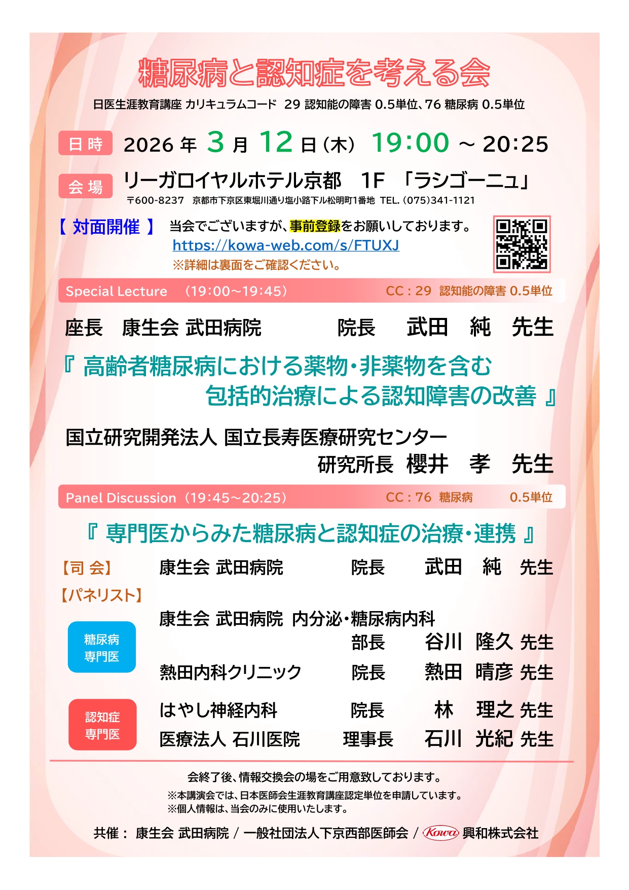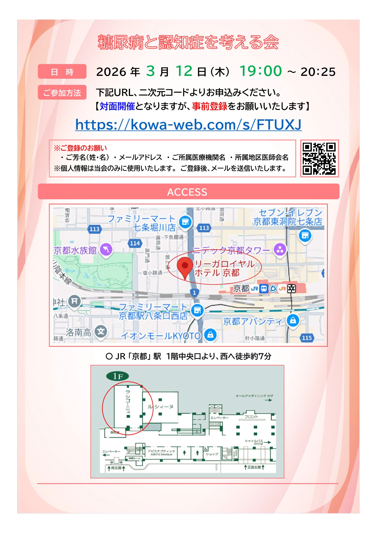 以下の要領にて「糖尿病と認知症を考える会」を開催いたします。奮ってご参加ください。