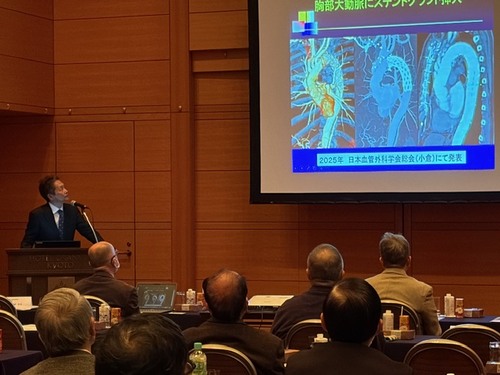 朴昌禧副院長は、スライドと実際の症例を用いながら手術療法・保存療法について丁寧に解説しました。メスを握る外科医(高侵襲)とカテーテルを握る外科医(低侵襲)の二刀流で治療を行うこと、急性大動脈解離の治療は診断がついてから手術までの時間短縮が肝要でありホットラインを活用することで救命できる患者さんが増えると案内され講演Ⅰを締めくくりました。