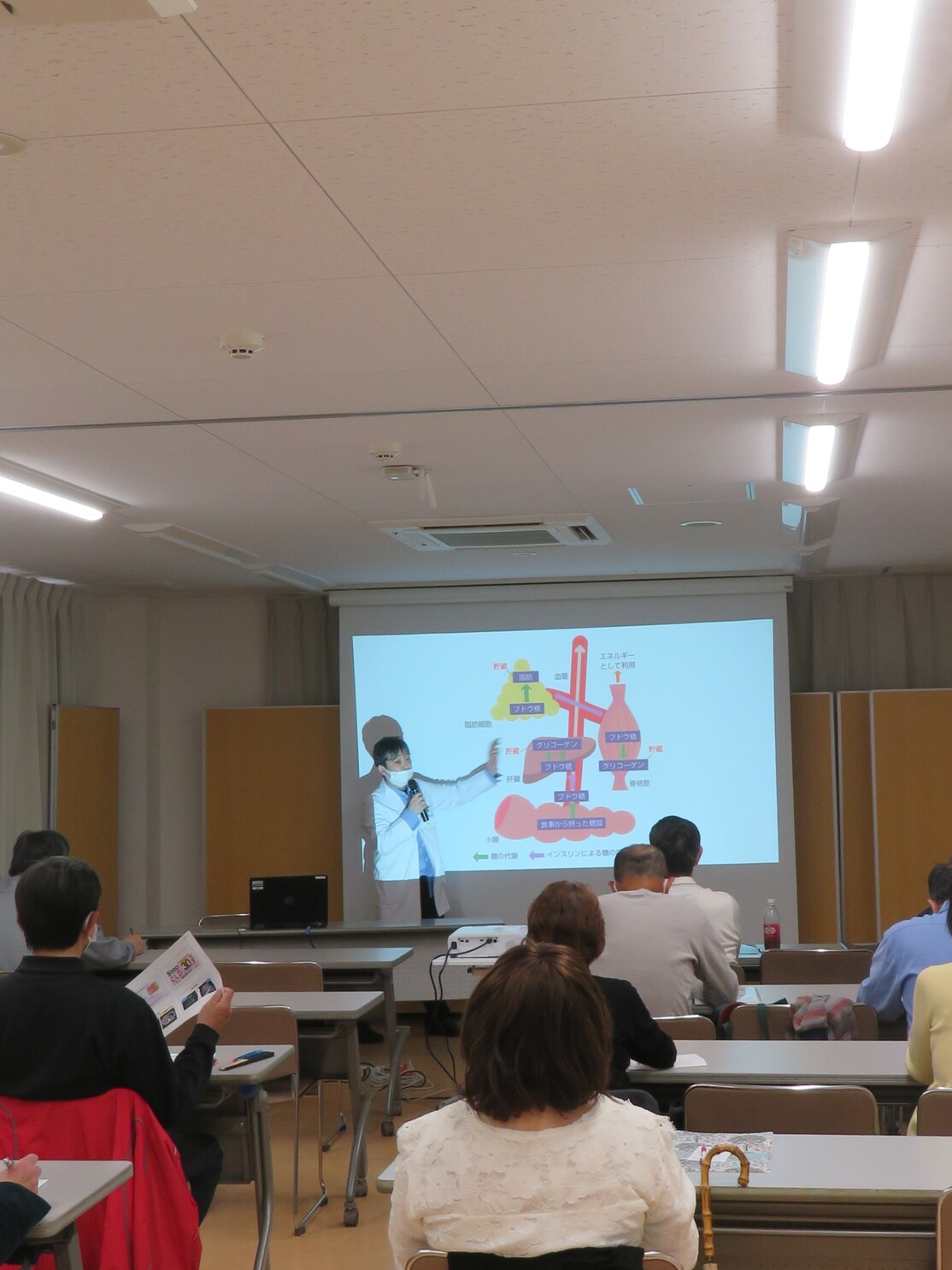 次に米澤臨床検査技師より「知っておきたい検査値~糖質~」をテーマにお話頂き、普段目にする血液検査結果の見方について、血糖値やHbA1c、尿糖のなど検査値について詳しく教えていただきました。今後、ご自身の検査結果を目にする際に今日学んだ知識を活かしていただけたらと思います。