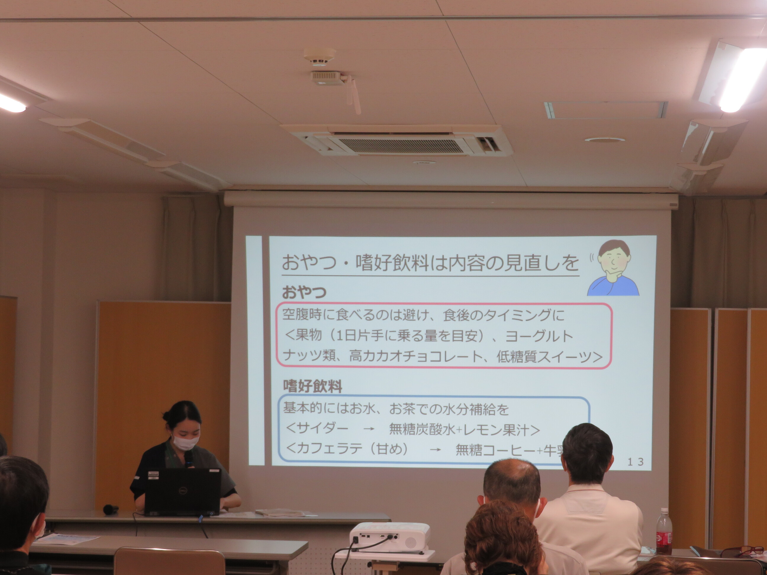 最後に杉山管理栄養士より「食事療法の基本~糖尿病~」をテーマにお話ししました。新年度でもありますので改めて食事療法について振り返り、食事のポイントについて知識を深めていただきました。振り返りを基に今年度の目標を改めて立てていただけたらと思います。