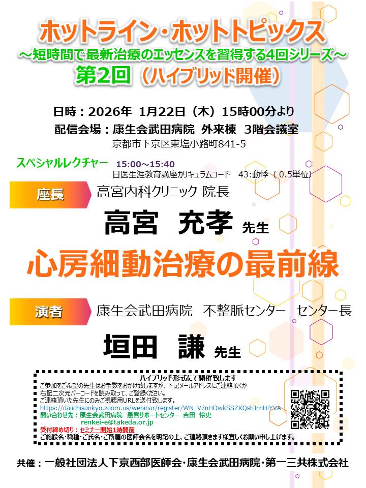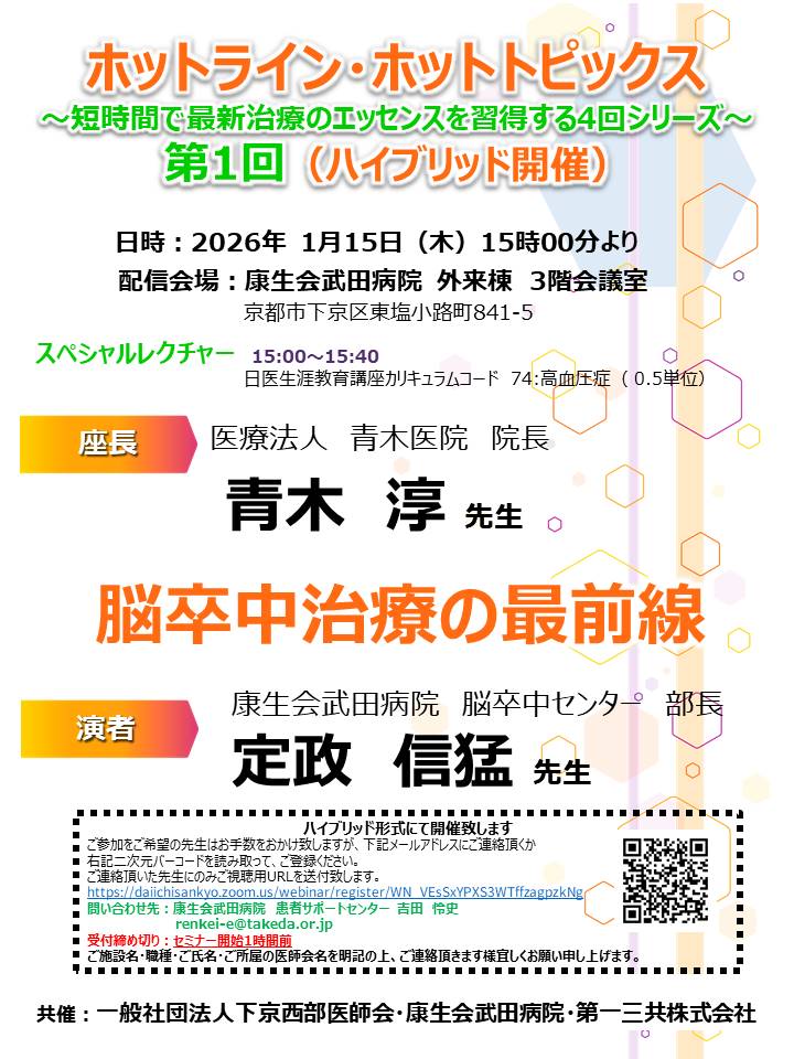 以下の要領にて「ホットライン・ホットトピックス~短時間で最新治療のエッセンスを習得する4回シリーズ~」の第1回、第2回をハイブリッドにて開催いたします。奮ってご参加ください。