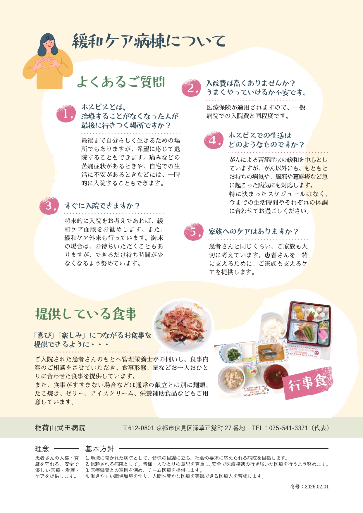 稲荷山だより 2026冬号 2026/01/24 インフォメーション 稲荷山武田病院 稲荷山武田病院では、日常で気を付けたい疾患や当院での取り組みをご紹介する「稲荷山だより」を発行しています。2026冬号を発刊いたしましたのでぜひ、ご覧ください。今号ではチャプレン談話や、緩和ケア病棟について『よくある質問』、提供している食事をご紹介しています。 前の記事へ 次の記事へ 施設ページへ 一覧を見る